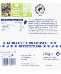 Ritter Sport Chocolate is a brand of German chocolate bars that have been around since 1912. It is a square-shaped chocolate bar that comes in a variety of flavors, such as hazelnut, almond, and marzipan. The chocolate is made with high-quality ingredients and is known for its unique taste and texture. It is also known for its unique packaging, which features a colorful design and a unique shape. Ritter chocolate is a favorite among chocolate lovers, as it is a delicious and unique treat. It is also a great way to show someone you care, as it is a thoughtful and delicious gift. Ritter chocolate is a great way to enjoy a sweet treat and is sure to please any chocolate lover. German chocolate bars are a great way to enjoy a delicious treat and Ritter Sport Chocolate is one of the best. Order Ritter Sport Daydream Yogurt now!