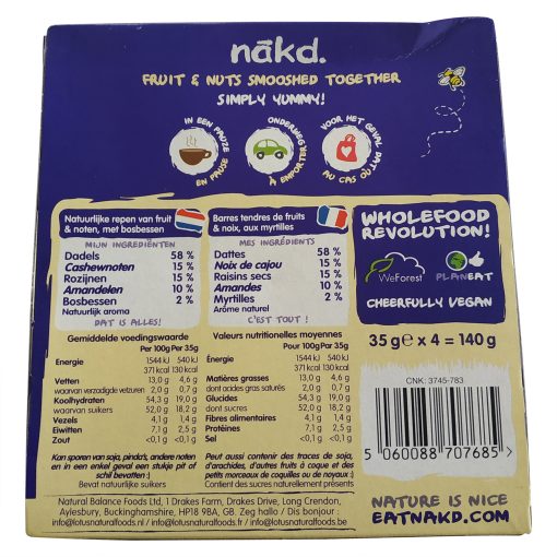 The Nakd bluberry muffin is made from dates, cashews, raisins, almonds, and blueberries.”